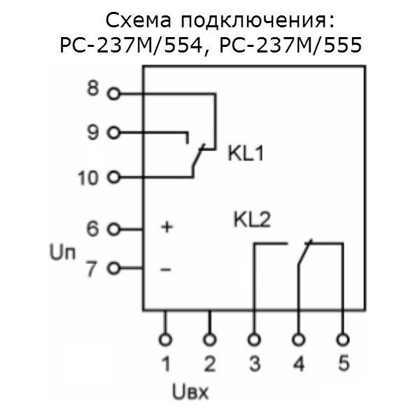 Реле РС-237М/555 имеет один переключающий контакт, срабатывающий при превышении входным сигналом параметра срабатывания, и один переключающий контакт для сигнализации исправности блока питания, срабатывающий при подаче напряжения питания;